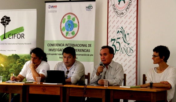 Con el objetivo de dar respuesta a estas interrogantes y fomentar un diálogo entre aquellos que formulan e implementan políticas y quienes generan conocimiento en el Perú, el Centro para la Investigación Forestal Internacional (CIFOR) congregó a representantes del sector público, del gobierno regional, la academia y la investigación durante un panel especial en la conferencia “Fortalecimiento de Capacidades para la Conservación de Una Amazonía Cambiante”, organizada por la Universidad de Richmond (EE.UU.) y la Universidad de Ucayali (UNU), en colaboración con CIFOR, el Woods Hole Research Center, ProPurús y el Instituto del Bien Común.