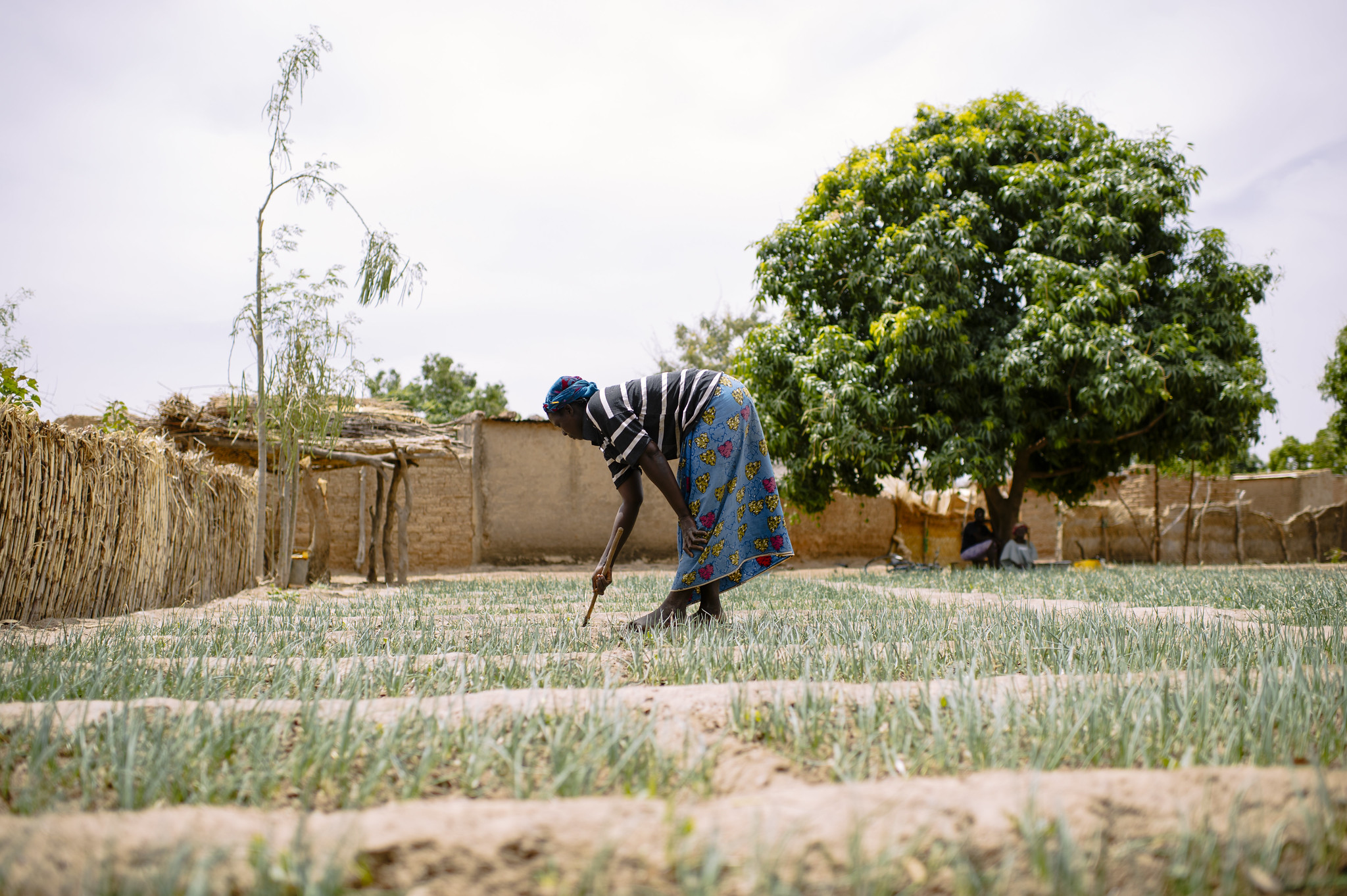 A farmer tends her crops in Tintilou village, Burkina Faso. Locally led adaptation and sustainable land use can foster positive climate tipping points that strengthen livelihoods and resilience.