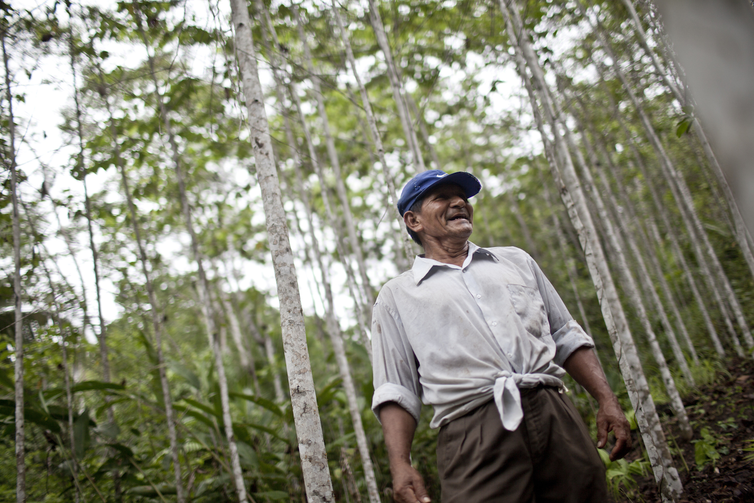 Hace apenas unos años, este era el campo de maíz de Segundo Saboya. Los árboles de bolaina crecieron después de que la vegetación natural se regenerara en su campo, y en unos años los árboles, que en esta región se gestionan normalmente en barbechos, estarán listos para su cosecha, proporcionando algo de dinero muy necesario para la familia de Saboya.