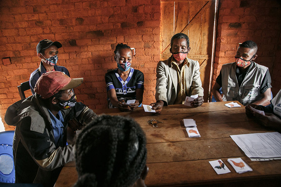 Community members in Madagascar play a hunting game to experiment with management options and imagine how to implement them in real life. Photo by Rijasolo/FAO