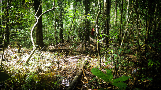Bhomia, investigador del Centro para la Investigación Forestal Internacional (CIFOR), está parado –o hundiéndose– en turba, una acumulación de hojas descompuestas, ramitas y otros elementos vegetales que se han asentado en el fondo de un aguajal en la región noreste de la Amazonía peruana.