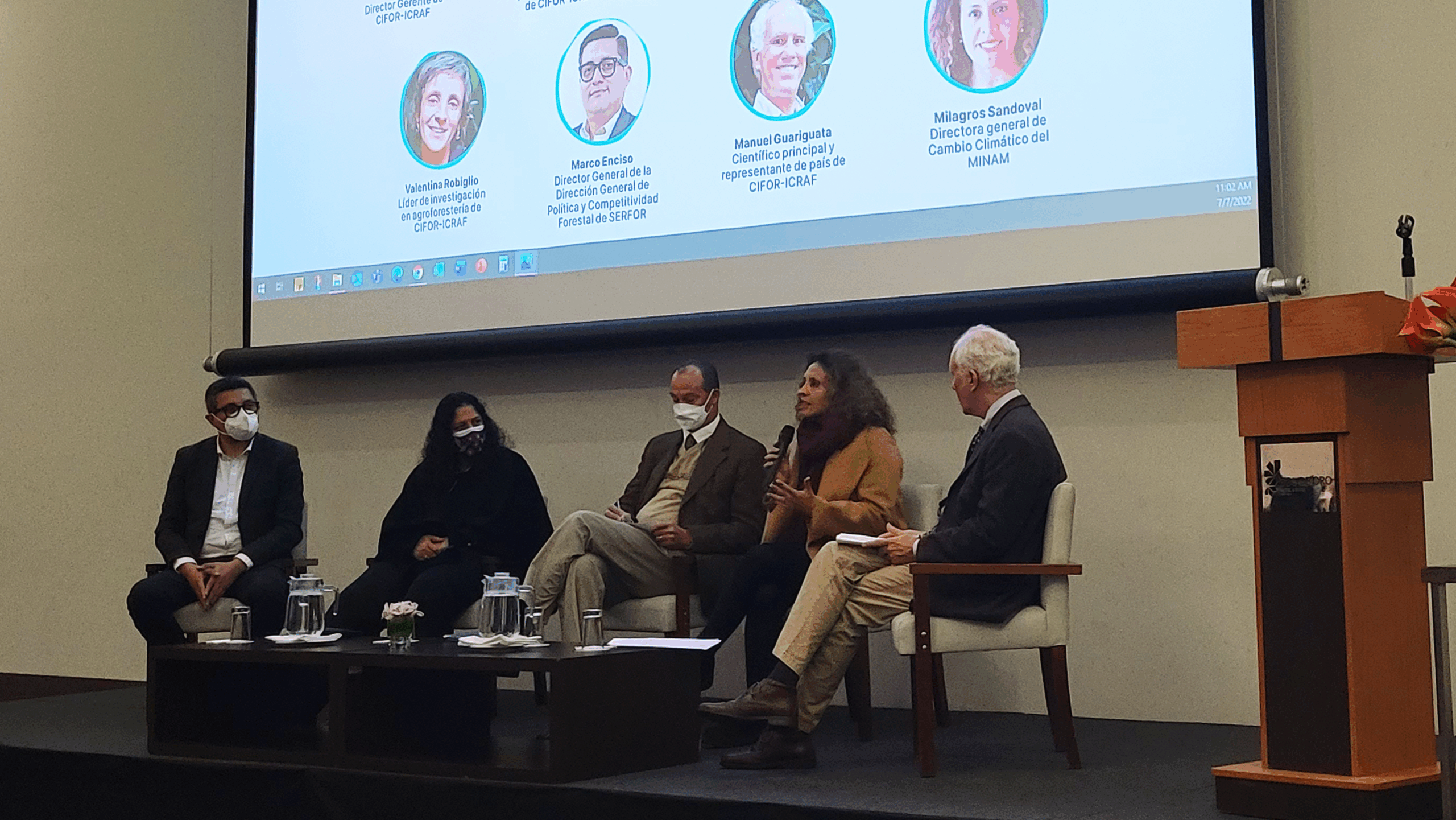 ¿Qué factores limitan esa conexión? ¿Cómo podrían abordarse para una mejor colaboración entre ciencia y políticas? Estas son algunas de las preguntas que guiaron el diálogo entre representantes del sector medioambiente, agricultura, desarrollo y cooperación en Perú durante un panel especial en el evento “Bosques, árboles y agroforestería para abordar desafíos locales y globales” organizado por el Centro para la Investigación Forestal Internacional y el Centro Internacional de Investigación Agroforestal (CIFOR-ICRAF) en Lima, Perú.