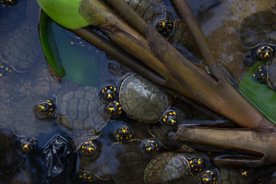 Un ejemplo de cómo las comunidades participan activamente en la conservación y el uso sostenible lo ilustra la conservación de las tortugas de manchas amarillas y las iniciativas de uso sostenible del pueblo Rupununi de Guyana, donde las comunidades vigilan los nidos de tortuga y reubican los huevos que de otro modo se inundarían.