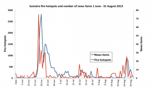 Ou plutôt, il semble que beaucoup aient posé cette question pendant que la fumée était encore en l’air, mais cet intérêt est lourdement retombé avec la fumée. Pour illustrer l’attention des médias grand public sur les incendies récents à Sumatra, nous avons comparé dans le temps le nombre de points chauds avec le nombre d’éléments d’information correspondants. Les points chauds détectés par satellites* au-dessus de Sumatra semblent fournir une représentation précise des incendies sur le terrain*. Nous avons effectué une recherche sur Google pour trouver, à l’échelle mondiale, des articles de presse sur le feu et la fumée à Sumatra et vérifié chaque résultat de recherche manuellement sur sa pertinence. Nous avons ensuite indiqué le nombre de points chauds et des 601 articles de presse entre le 1er juin et le 31 août 2013 (figure 1).