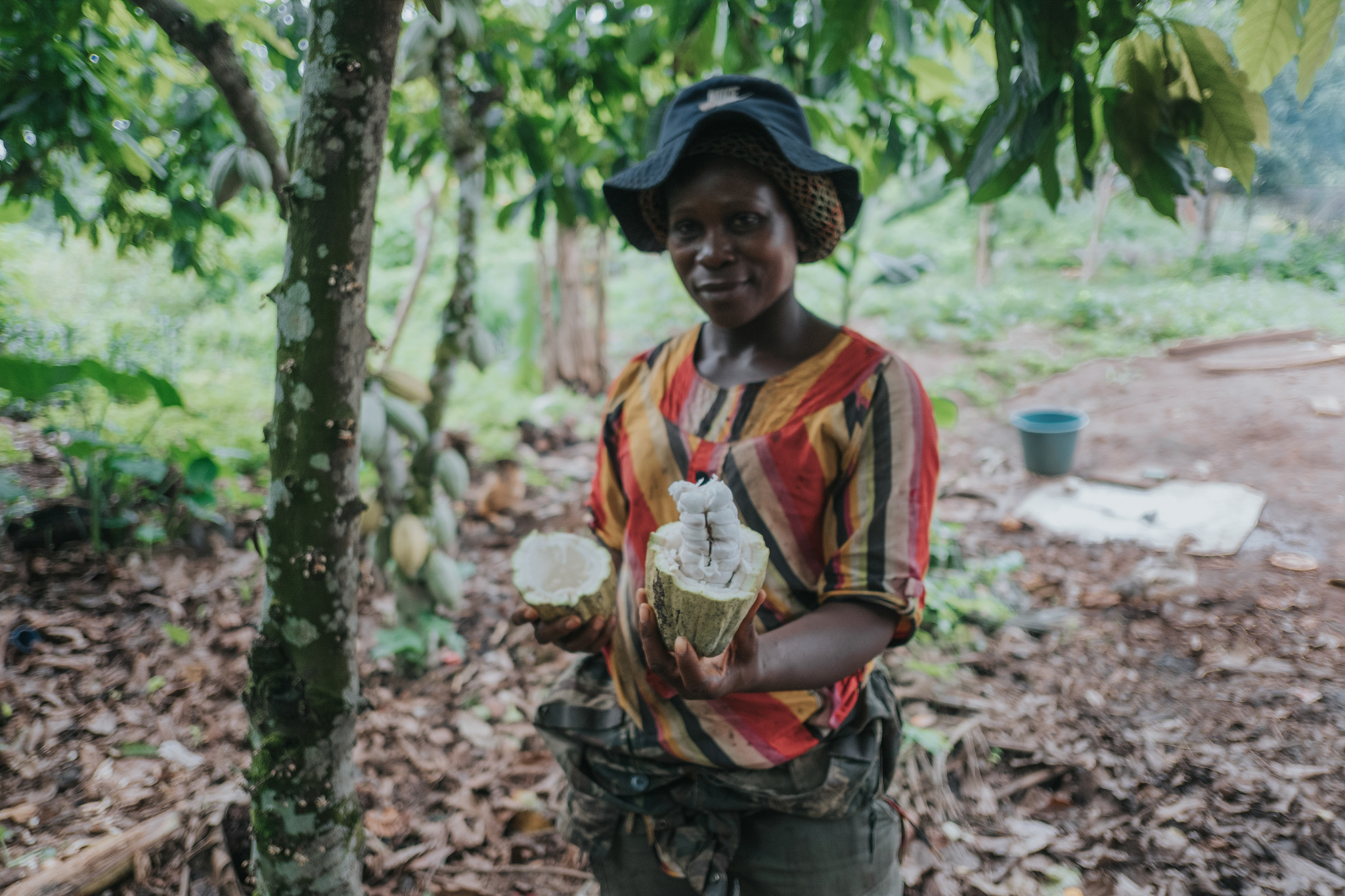 Rachel Olo, une cultivatrice de cacao camerounaise dont un hectare de terre rapporte 800 kg de cacao par an.