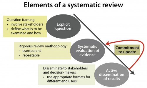 Review sistematis adalah inti dari inistiatif berbasis buki dalam bidang-bidang ini. Mereka menjadi alat informasi kuat yang membantu pengambilan keputusan yang baik; tanpa review sistematis tidak ada obat berbasis-bukti. Tetapi review sistematis belum menjadi praktik umum di masyarakat kehutanan, meskipun terdapat fakta yang menuntut pengambilan keputusan berbasis bukti terus berkembang (4). Terminologi seperti “kebijakan berbasis bukti” sering digunakan secara bebas dalam rangkuman kebijakan nasional dan internasional dalam kehutanan, sebagian besar tanpa definisi (5).